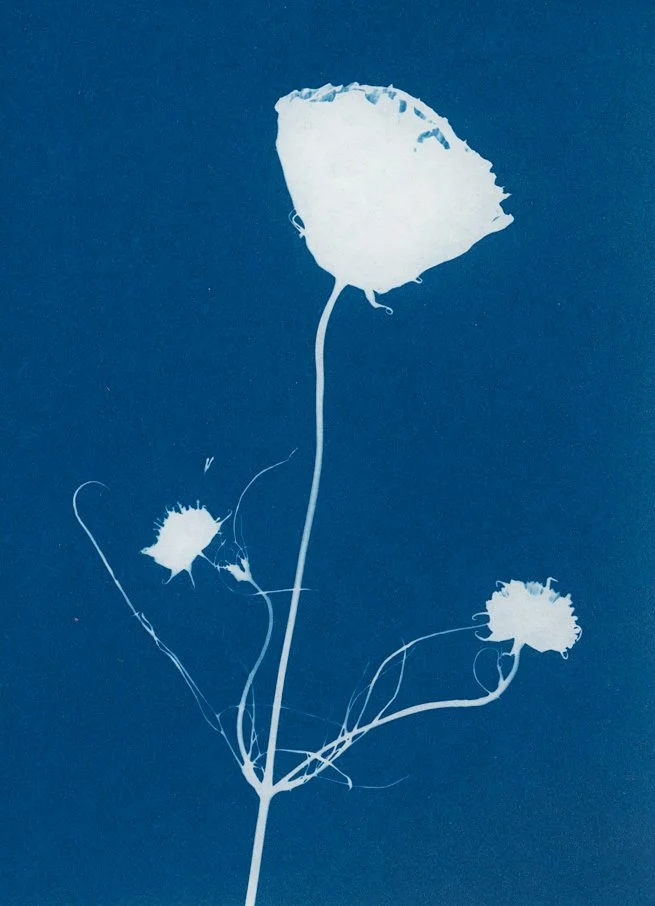 The cyanotypes shown here – also known as iron-blue prints – depict plants from Tina’s garden. Some were carefully dried, others exposed directly to sunlight. Through this historical photographic printing process, rendered in deep shades of blue, the subjects take on a personal, poetic quality.